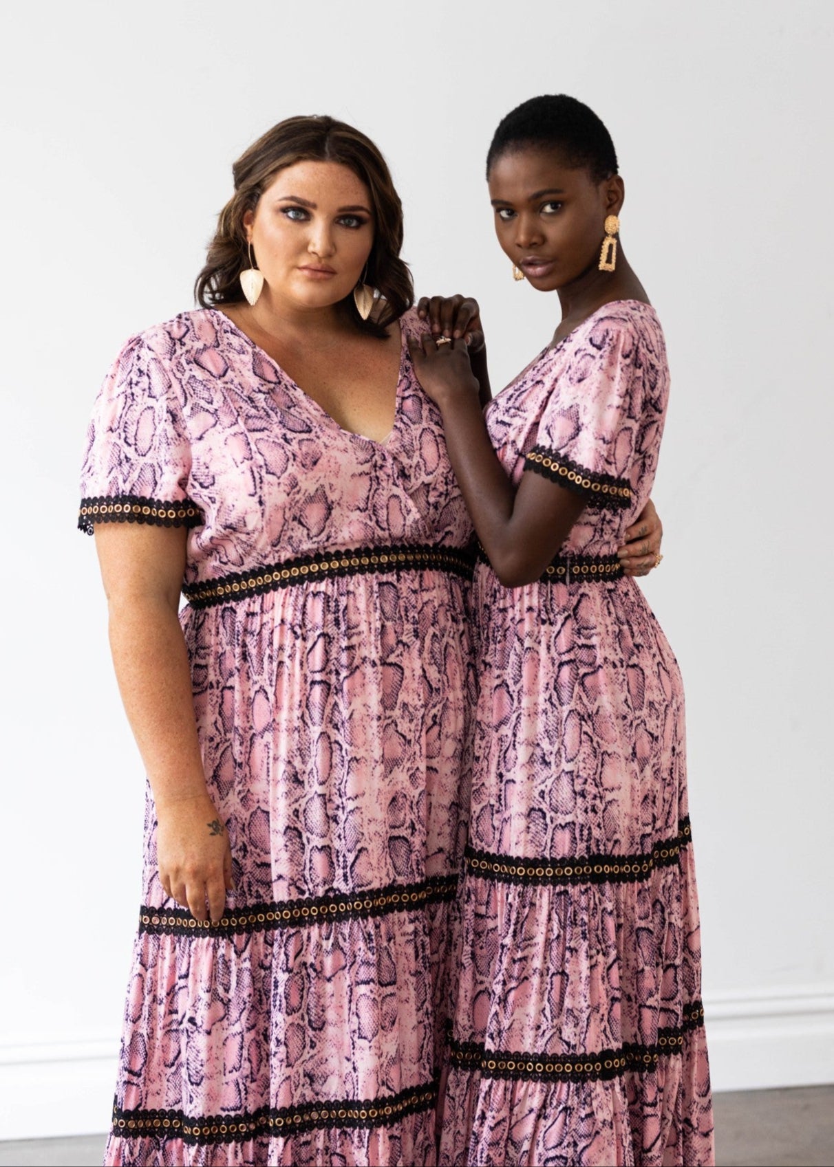 Venice Maxi Dress in Pink Snakeprint with Black Lace Trim